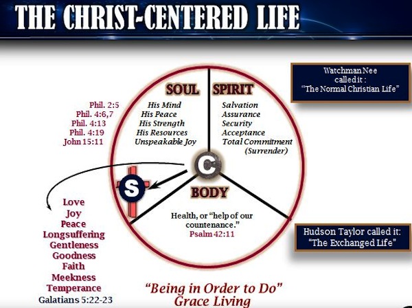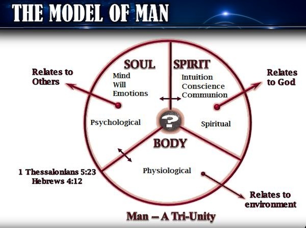 The Wheel Diagram depicts man as a three-part being consisting of spirit,soul and body (I Thess. 5:23). With the body, through the senses, we relate to our surroundings. The soul, or personality, consists of the functions of the mind, will and emotions. The soul enables us to relate to one another. The spirit enables us to transcend our abilities, limitations and circumstances as we are regenerated or reborn and indwelt by the Holy Spirit.