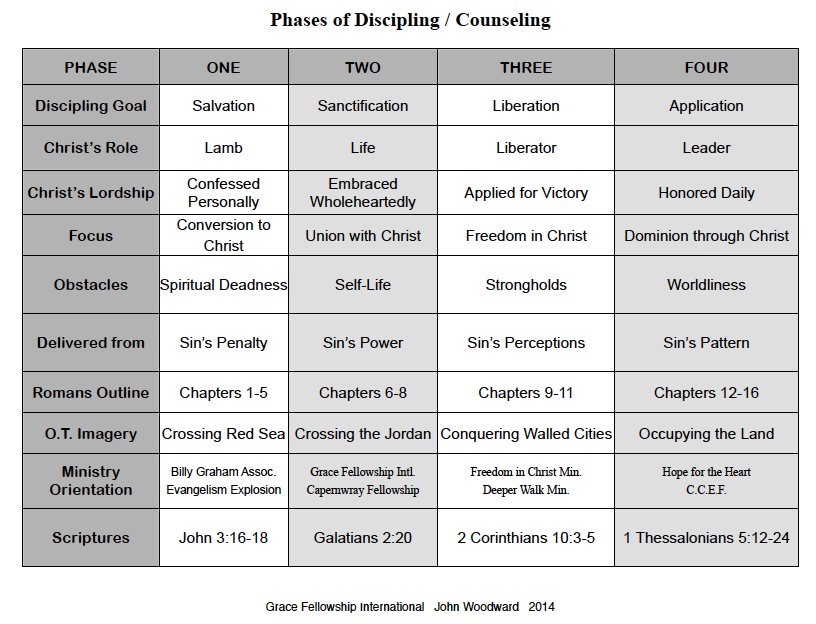 Usually the appropriation of one’s identification with Christ by faith should be followed by a freedom in Christ process. Strongholds such as a wrong concept of God, unforgiveness, and other areas of deception need to be replaced with truth. Christ declared, “…you shall know the truth and the truth shall set you free” (John 8:32). After the counselee has the power and freedom to live out of his/her new identity in Christ, residual problem areas can be addressed through topical grace discipleship. We advocate, therefore, a four phase ministry process as illustrated by the following diagram: